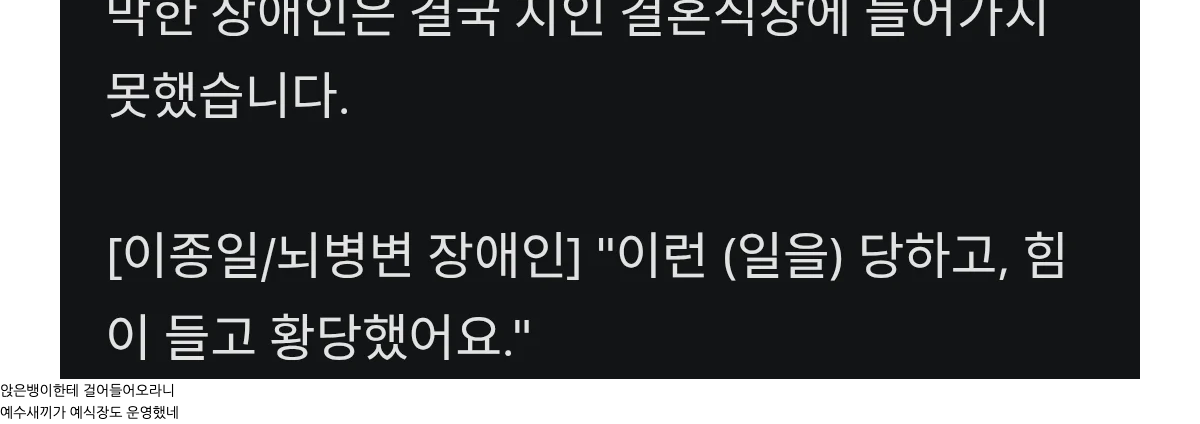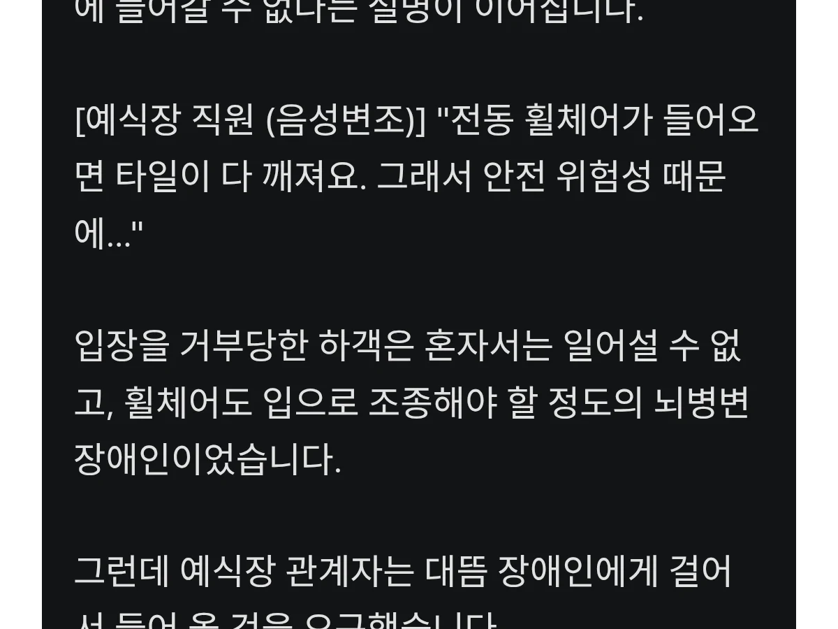 진짜 이게 실화인가 싶음. 전신마비라 휠체어 없으면 이동도 못 하는 분한테 예식장 직원이