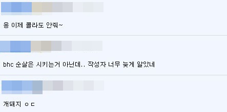 "개 돼지 인정" "bhc 순살 = 동네 슈퍼에서 파는 순살너겟" 등의 반응을 보였다.