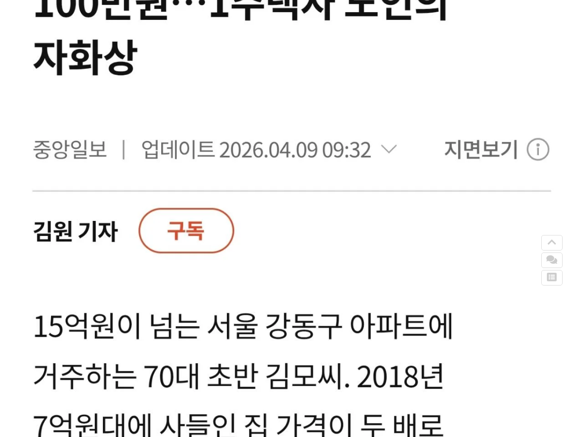 ![]() ![]() ![]() 집값은 15억이나 되는데 정작 쓸 수 있는 생활비는 월 100만 원 정도인 1주택자 노인들이 많다고 함. 자산은 부동산에 다 묶여 있고 소득은 적다 보니, 겉으로 보기엔 부자 같아도 실제 생활은 팍팍한 경우가 꽤 있는 듯. 이게 요즘 고령층 1주택자들의 현실을 보여주는 자화상 같네.